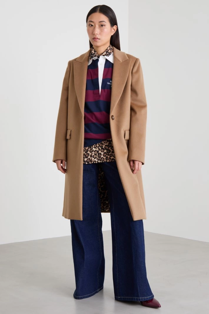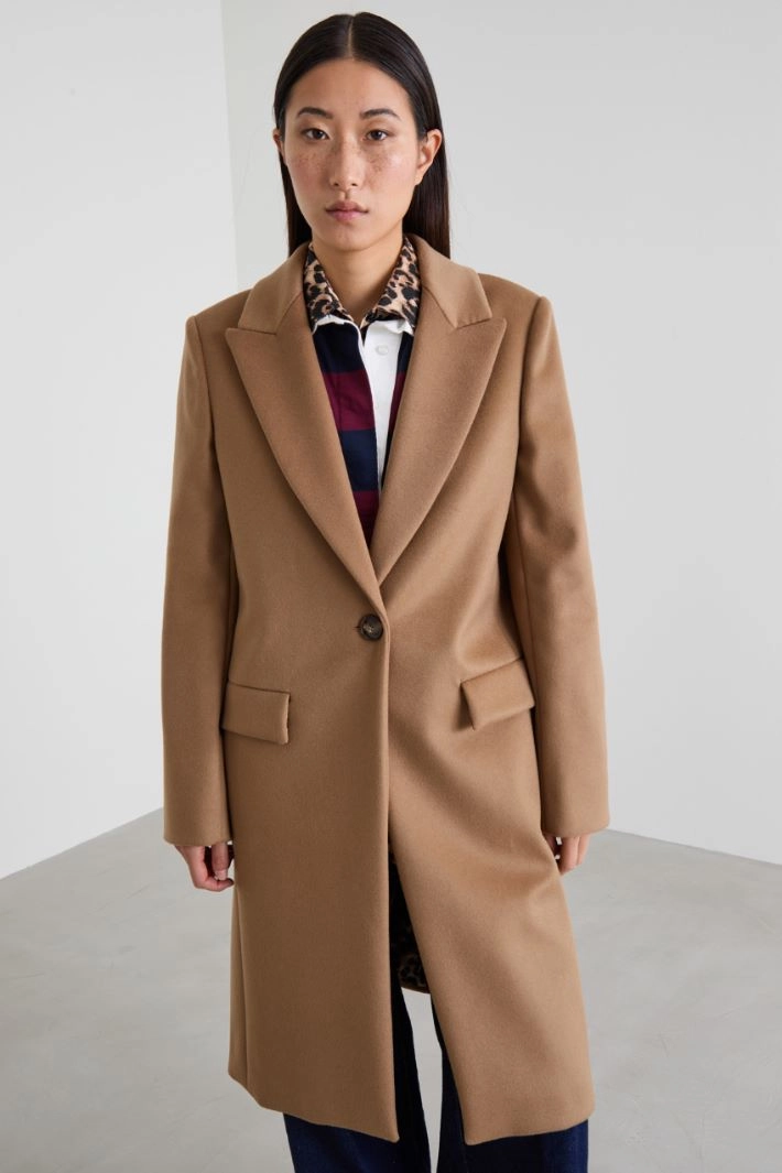 Straight-fit coat in pure wool drap, with lapel collar, long sleeves and side welt pockets with flap. Central vent and single-breasted fastening with button. Featuring an animalier-printed inner lining with a logo.