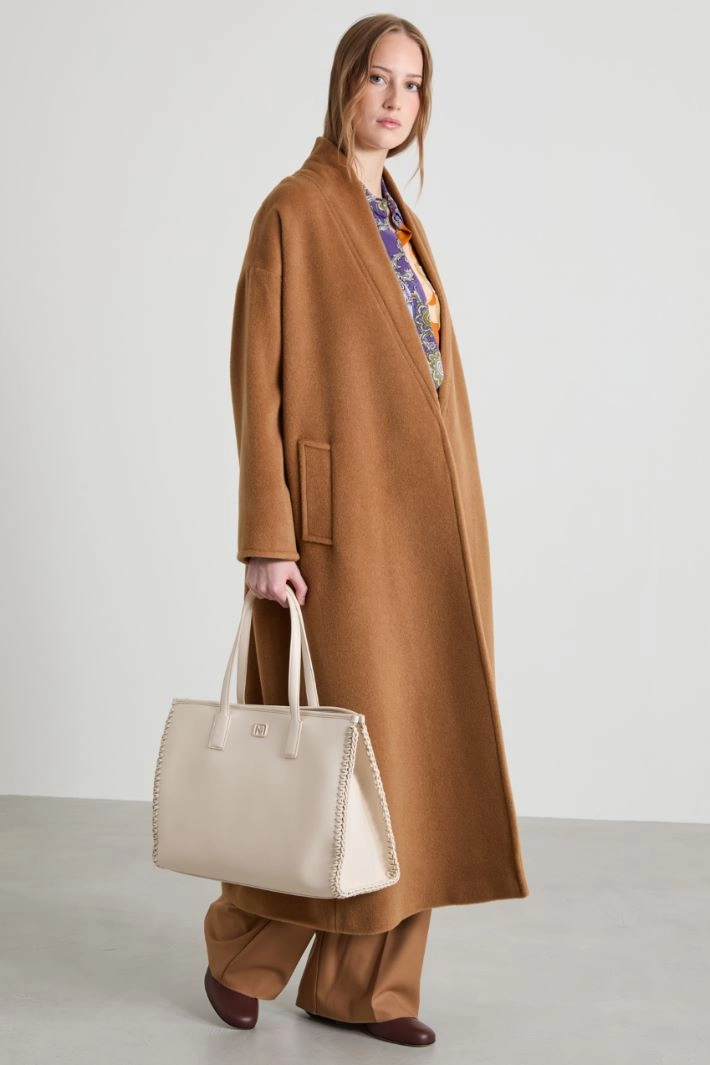 Straight-fit robe coat in pure wool beaver, with shawl collar, long dropped sleeves, side welt pockets and a slit at the centre back. Single-breasted fastening with a belt. Lined.