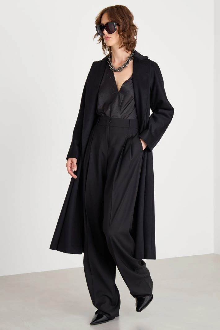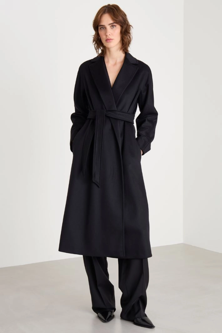 Straight-fit coat in pure virgin wool, featuring a lapel collar, long kimono sleeves, inset pockets, and piping with a fine stitching. Belt fastening. Lined.