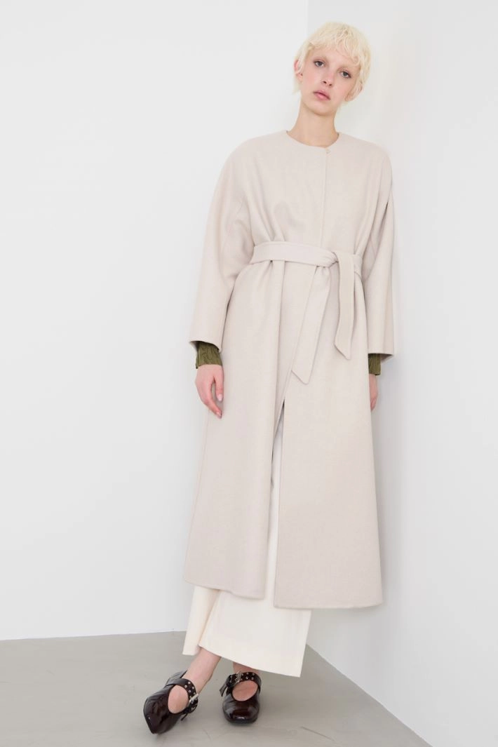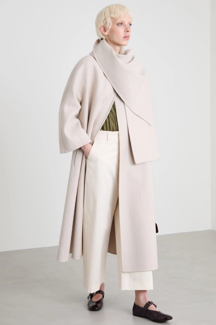 Long flared coat in double wool and cashmere, with round neckline, long kimono sleeves, inset side pockets and single-breasted fastening with a single button. Matching scarf and belt. Unlined.