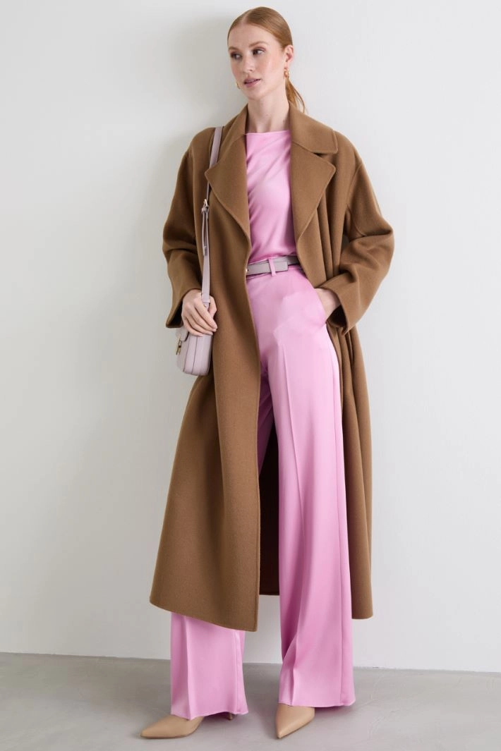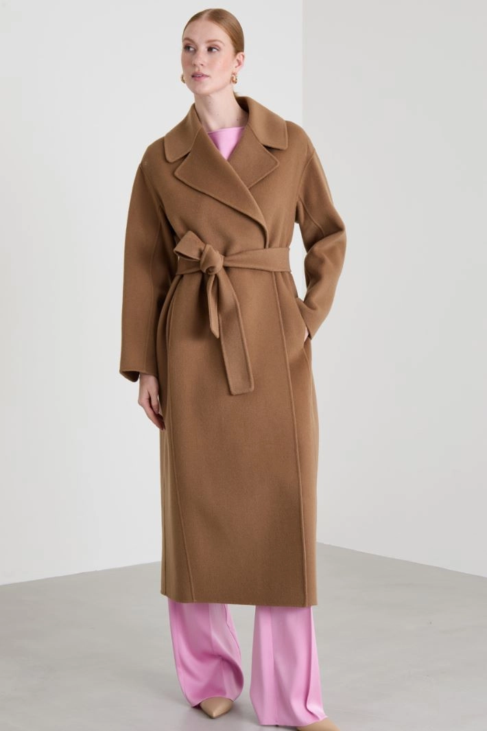 Straight-fit coat in double wool blend fabric, with lapel collar, long sleeves and inset pockets. Matching belt.