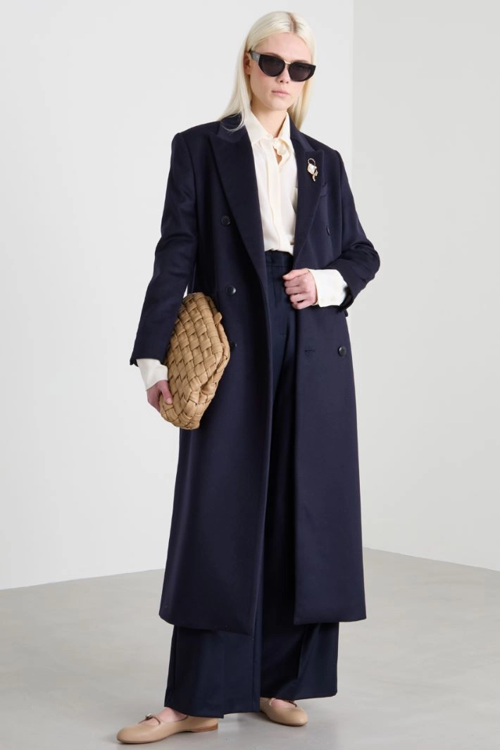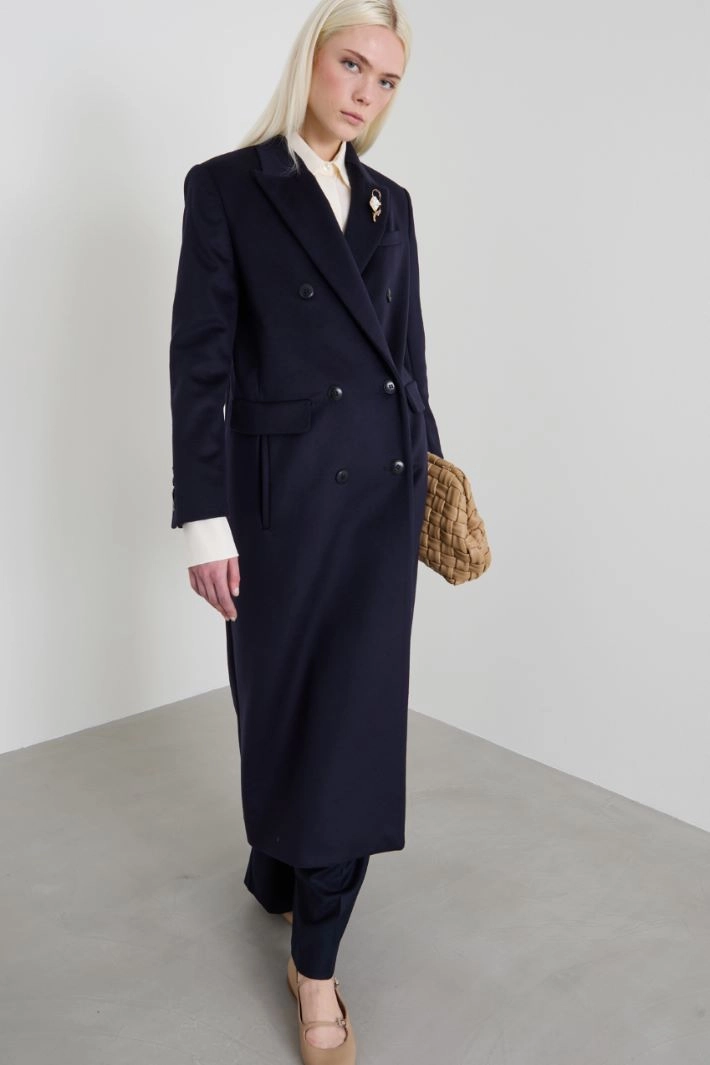 Long straight-fit coat in pure wool drap, with lapel collar, long sleeves with buttons, breast pocket, side welt pockets with flap and central vent on the back. Double-breasted fastening with buttons. Lined.