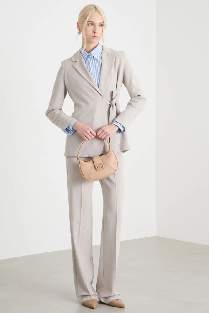 Semi-fitted canvas blazer with a lapel collar, featuring a self-tie sash on the side. Lined.