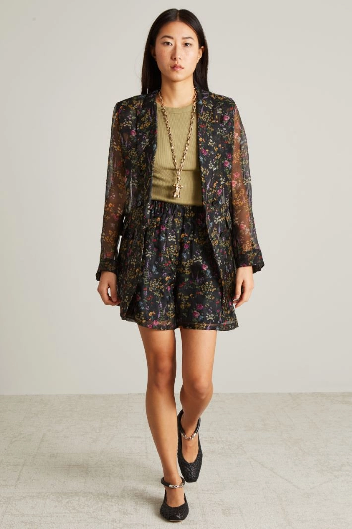 Blazer-style duster in printed pure silk organza, with peak lapel collar, long set-in sleeves with buttons, breast pocket, welt pockets with flap applied on the front and side slits on the back. Double-breasted fastening with buttons.
