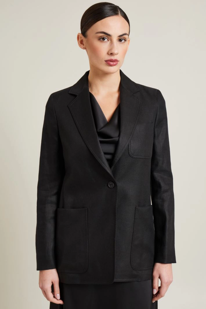 Fitted blazer in pure twill linen fabric, with lapel collar, long sleeves, patch pockets, central vent on the back and single-breasted fastening with a single button. Partially-lined.