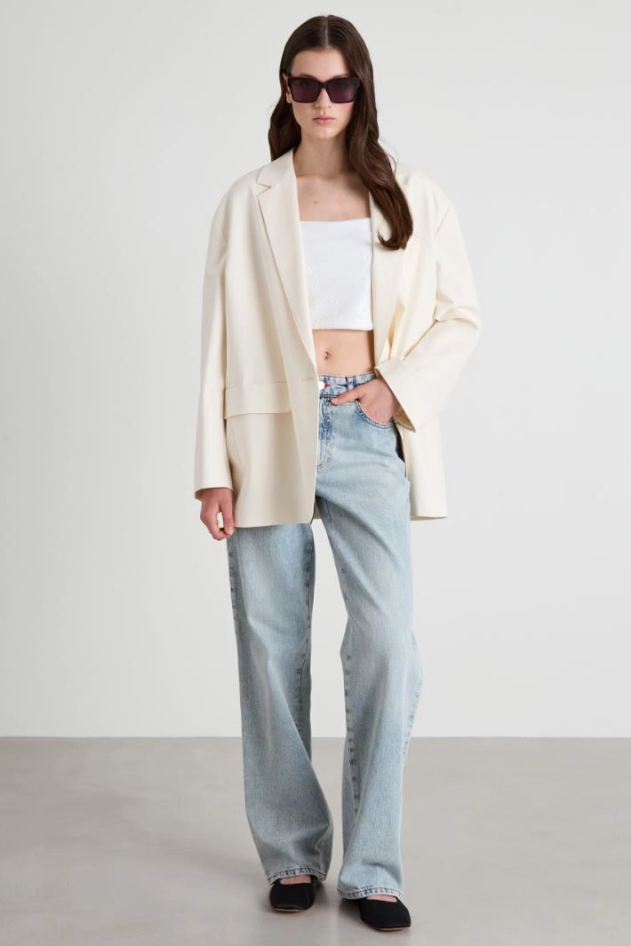 Oversized blazer in stretch cotton canvas, with sartorial trim, lapel collar, long sleeves with buttons, pocket and welt pockets with flap on the sides. Central vent on the back and single-breasted fastening with button. Lined.