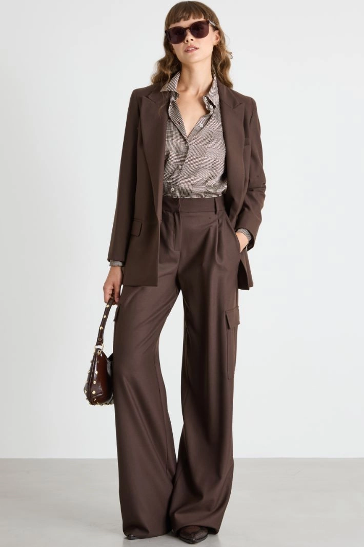 Fabric 54% polyester, 40% virgin wool, 6% elastane; lining 64% acetate, 36% polyester.