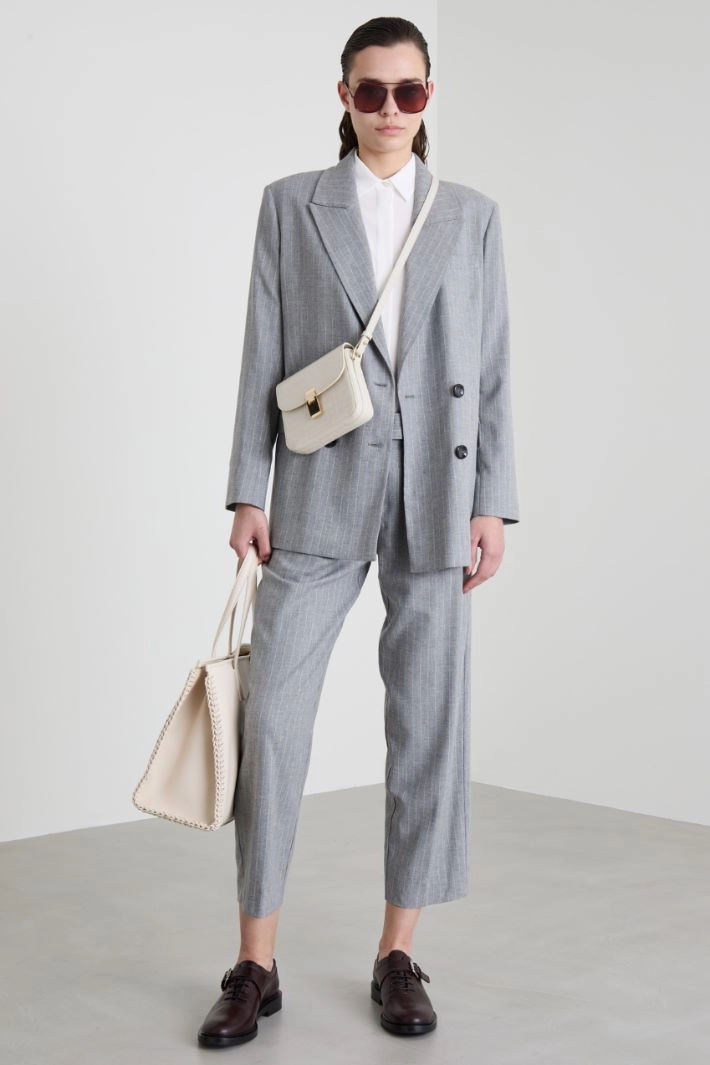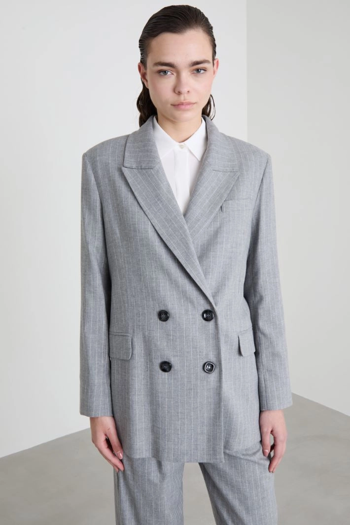Straight-fit blazer in stretch viscose blend fabric, with a peak lapel, long sleeves, a chest pocket and double-welt side pockets with flaps. Central vent on the back and double-breasted fastening with buttons. Lined.