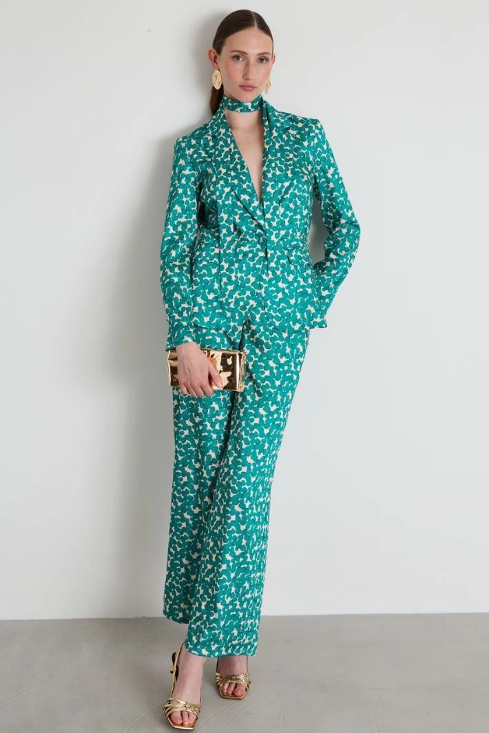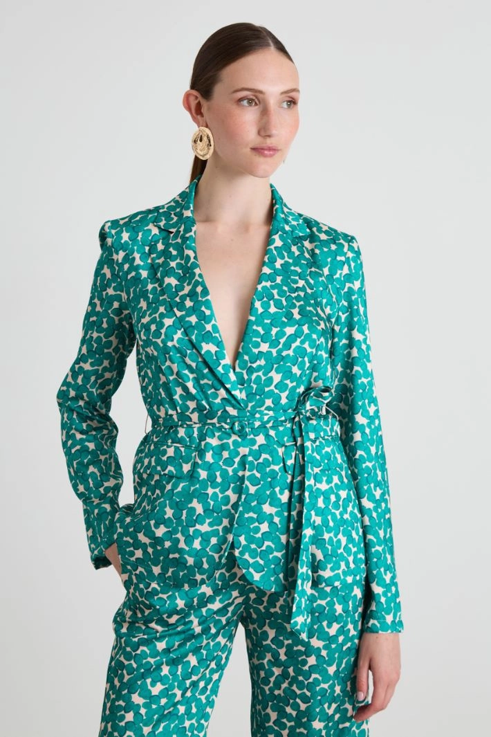 Flowing blazer in printed twill, with lapel collar, long sleeves, double-welt side pockets with flap and single-breasted button fastening. Matching belt. Unlined.