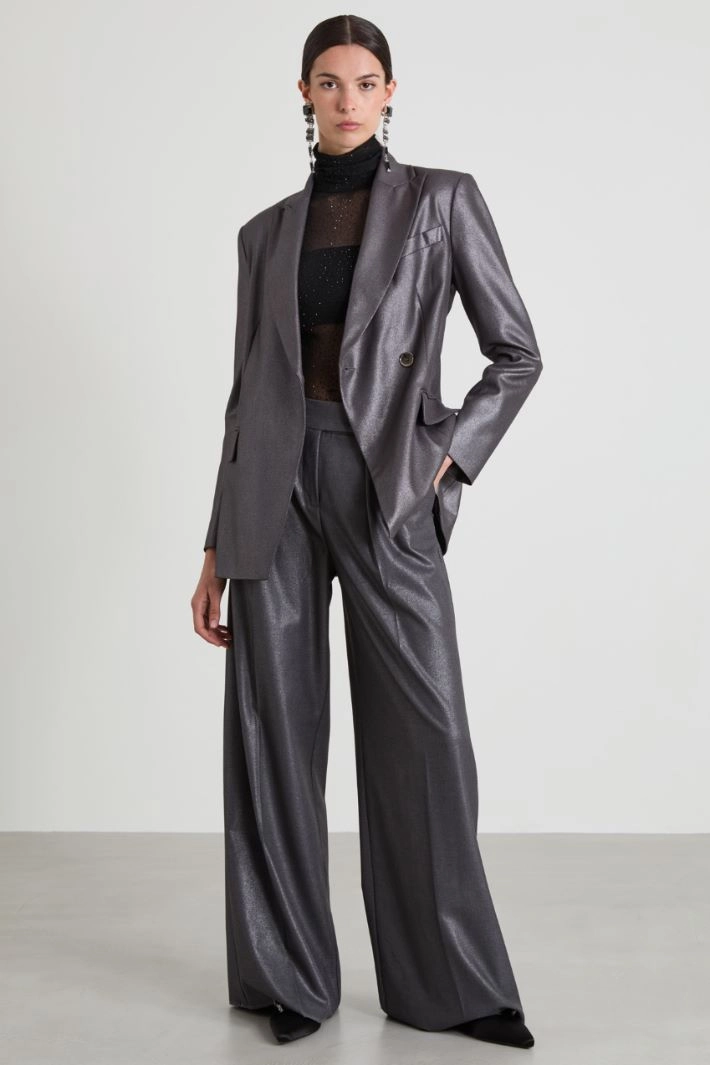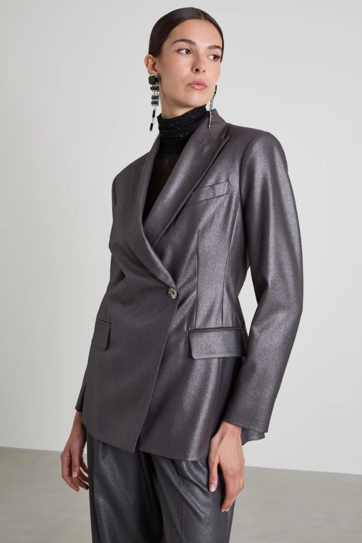 Regular-fit blazer in stretch viscose blend twill with laminated finish, featuring peak lapels, long sleeves, welt pockets on the chest, flap pockets on the sides and a vent on the center back. Double-breasted button fastening. Lined.