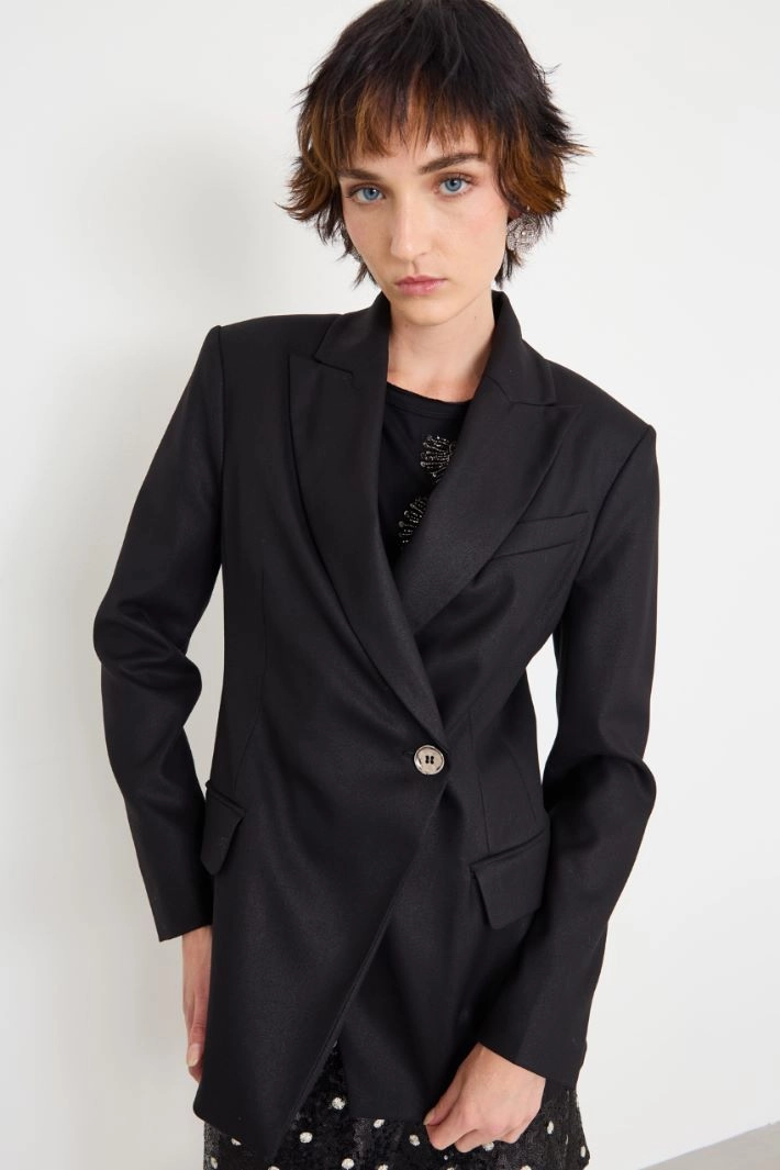 Regular-fit blazer in stretch viscose blend twill with laminated finish, featuring peak lapels, long sleeves, welt pockets on the chest, flap pockets on the sides and a vent on the center back. Double-breasted button fastening. Lined.