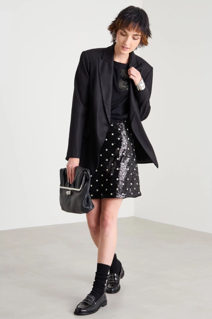 Fabric 65% polyester, 33% viscose, 2% elastane; - exclusive of coating; lining 62% acetate, 38% polyester.