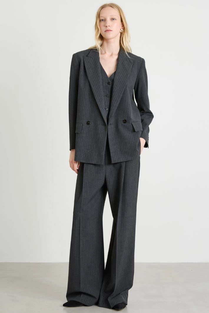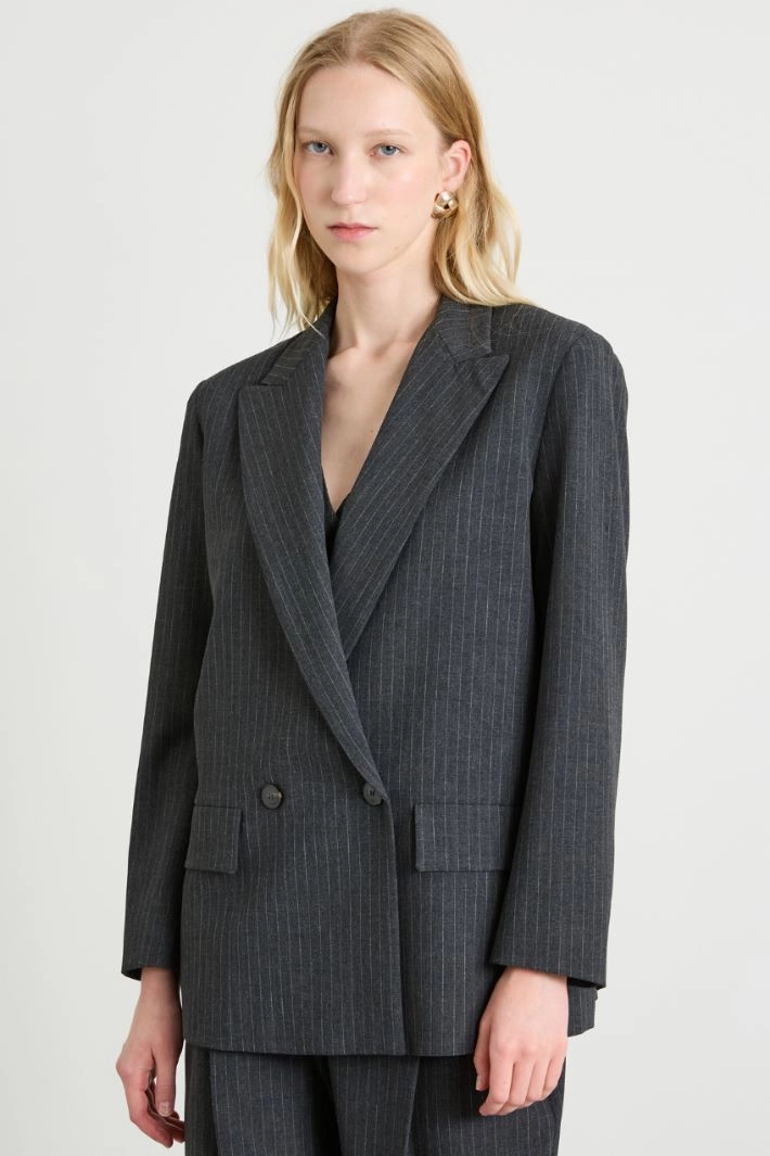 Straight-fit pinstriped blazer in viscose blend canvas with peak lapels, long buttoned sleeves, and flap pockets. Double-breasted button closure. Lined.
