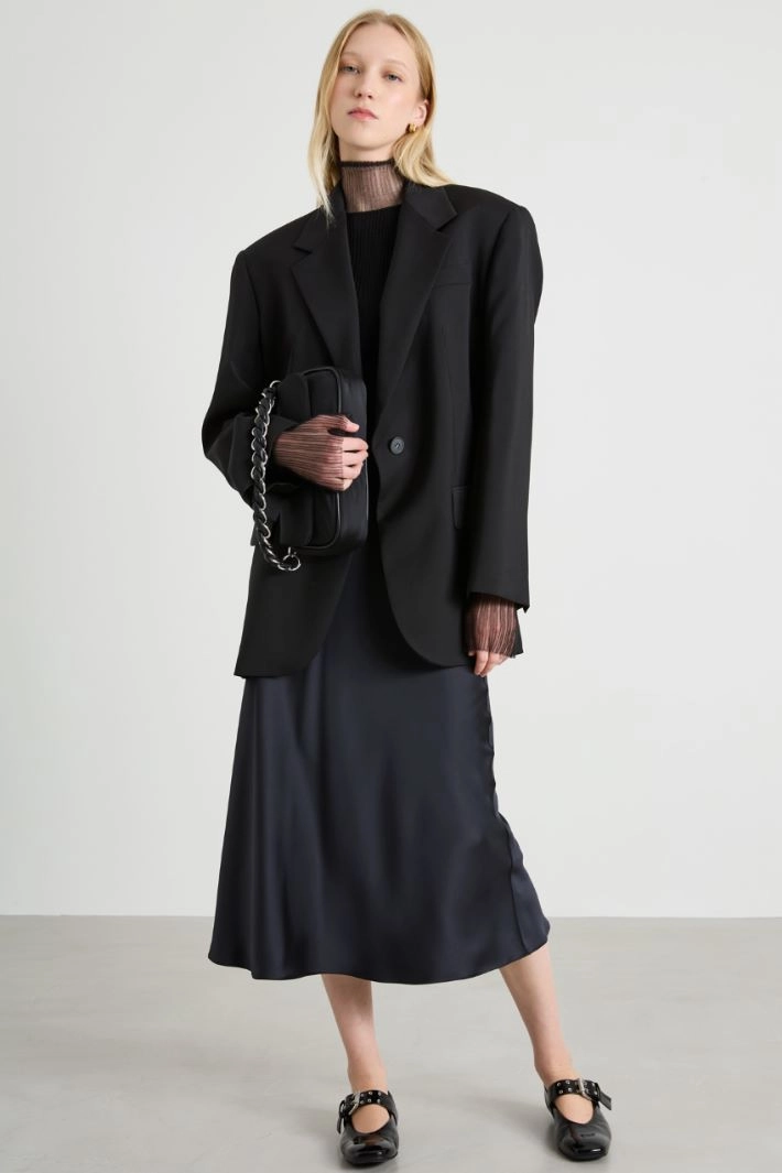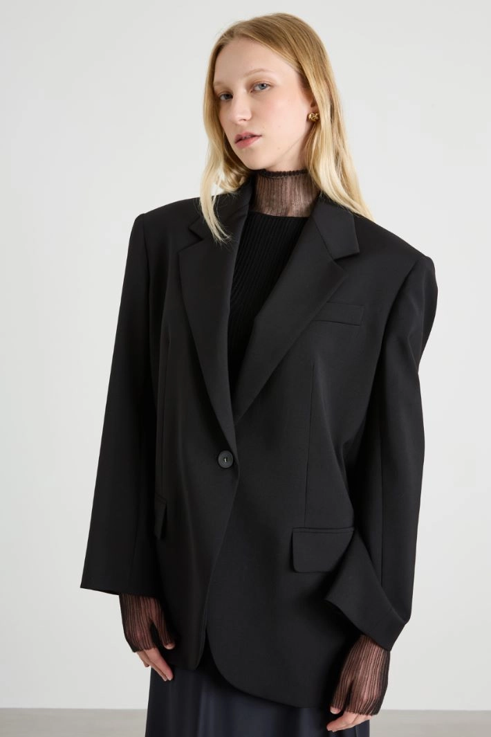 Oversized blazer in wool and viscose blend canvas, with lapel collar, shoulder pads, long sleeves, double welt side pockets with flap and central vent on the back. Central vent on the back and single-breasted fastening with a single button. Lined.