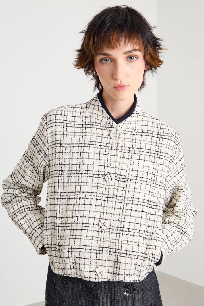 Straight-fit bomber jacket in lamé cotton blend tweed, featuring a stand-up collar, long sleeves, inset side pockets and single-breasted fastening with covered buttons. Lined.
