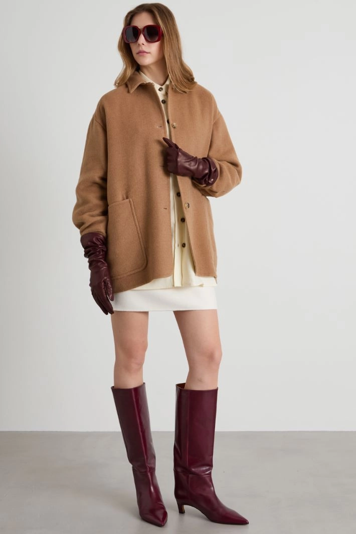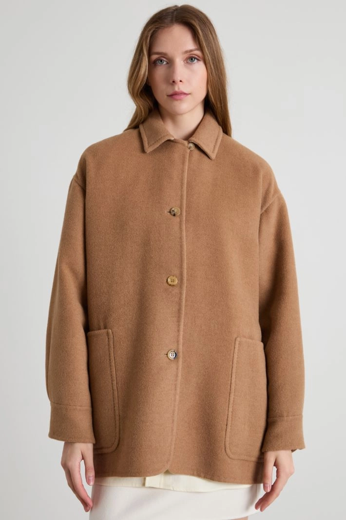 Straight-fit coat in double pure camel, with matching trim, shirt collar, long sleeves with cuff and button, and side patch pockets. Single-breasted fastening with visible buttons. Reversible model.