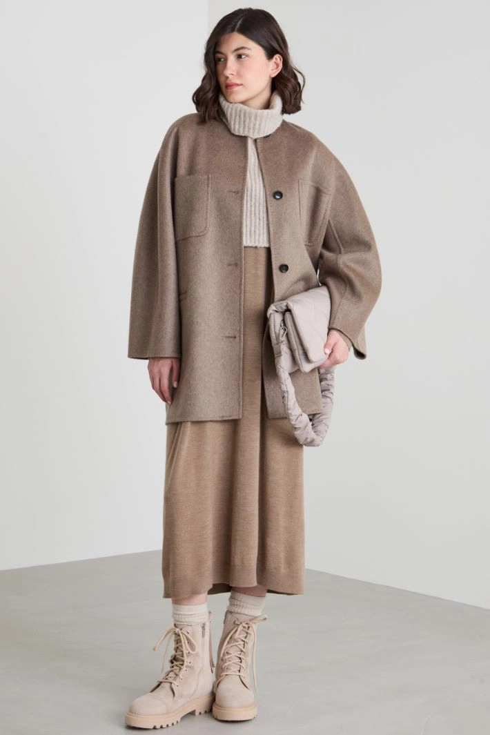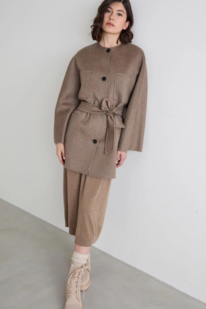 Straight-fit coat in pure sable cashmere drap, with round neckline, long kimono sleeves, patch pockets on the chest and welt pockets on the sides. Matching belt. Button fastening.