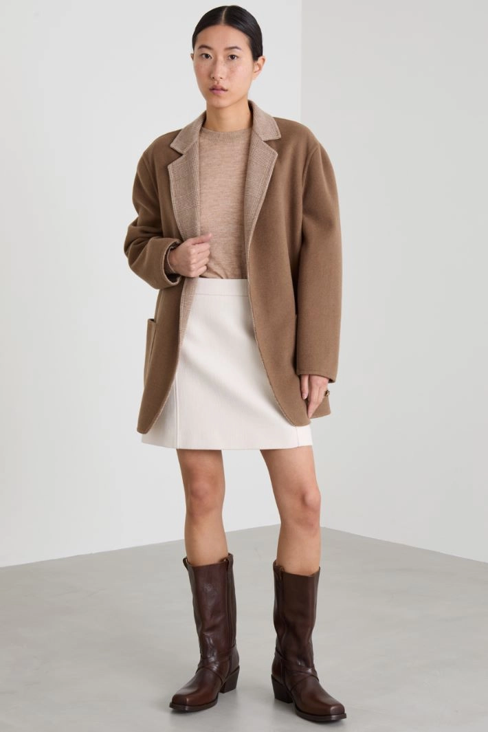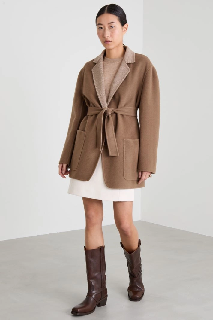 Short coat in double wool and cashmere, with lapel collar, long sleeves with dropped shoulders and side pockets. Fastening with a matching belt. Reversible model.