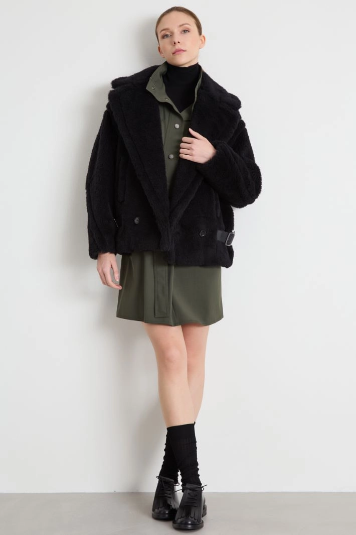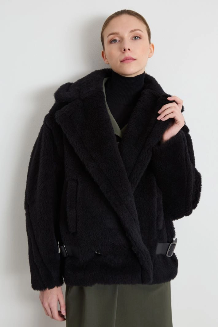 Oversized short coat in alpaca, wool and silk plush jersey, with lapel collar, long dropped sleeves, side welt pockets and adjustable genuine leather straps on the sides. Double-breasted button fastening. Lined.