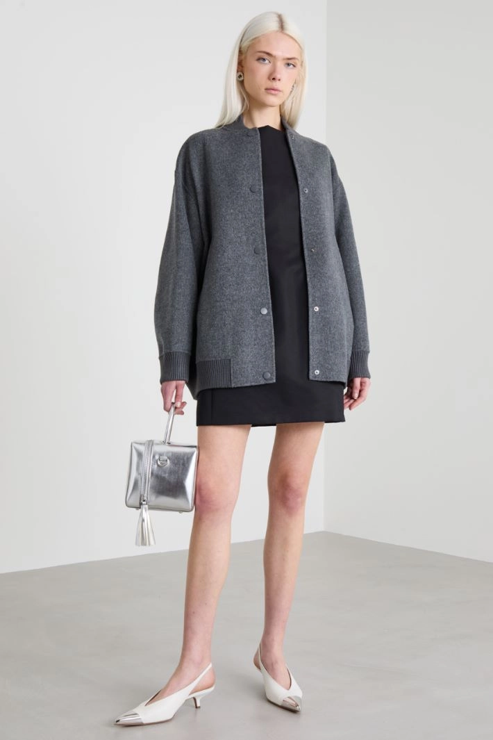 Straight-fit bomber jacket in double wool blend, with ribbed knit inserts, stand-up collar, long dropped sleeves and side welt pockets. Single-breasted fastening with press studs. Unlined.