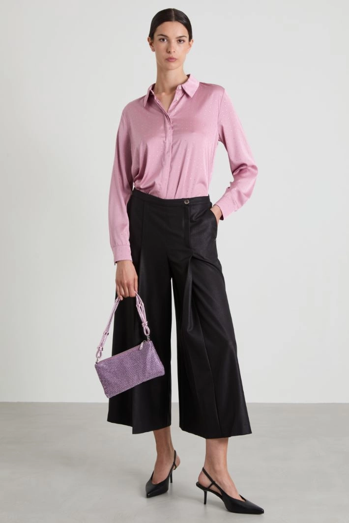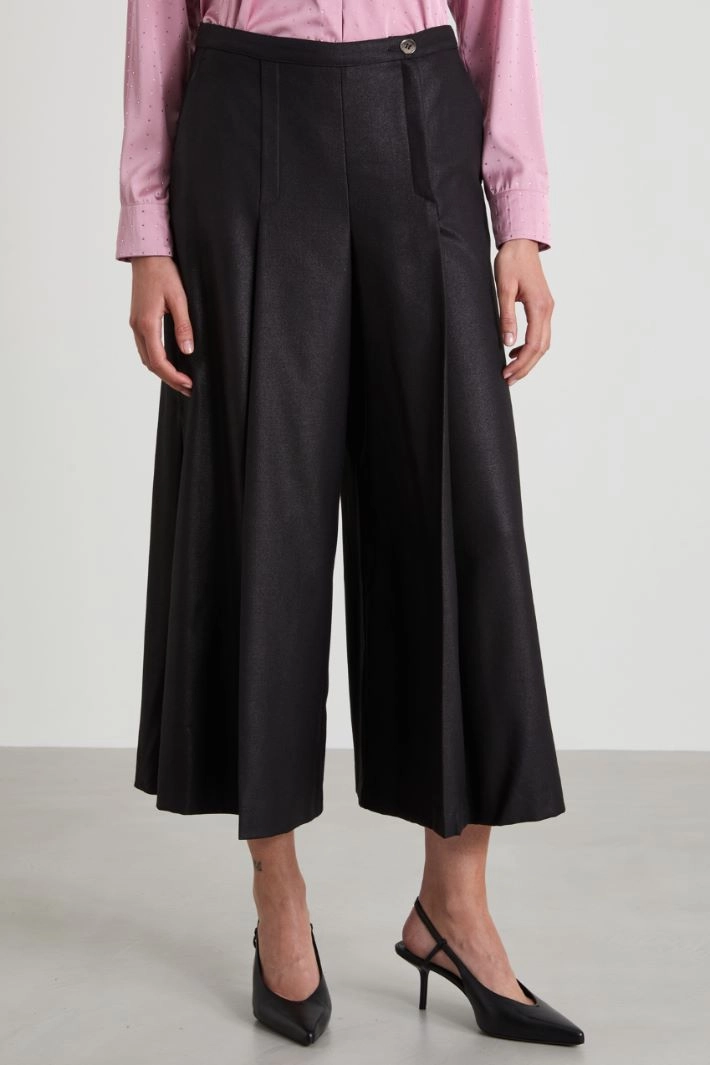 Wide-leg culottes in stretch viscose blend twill with laminated finish, French pockets and side pleats with slits. Asymmetrical fastening with zip and button.