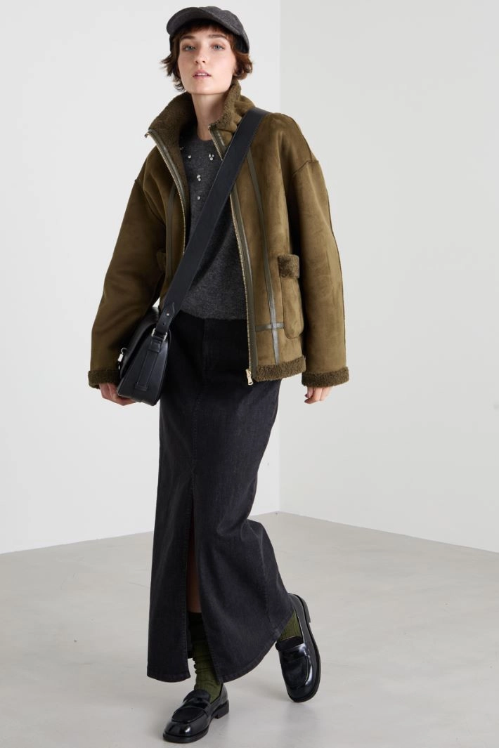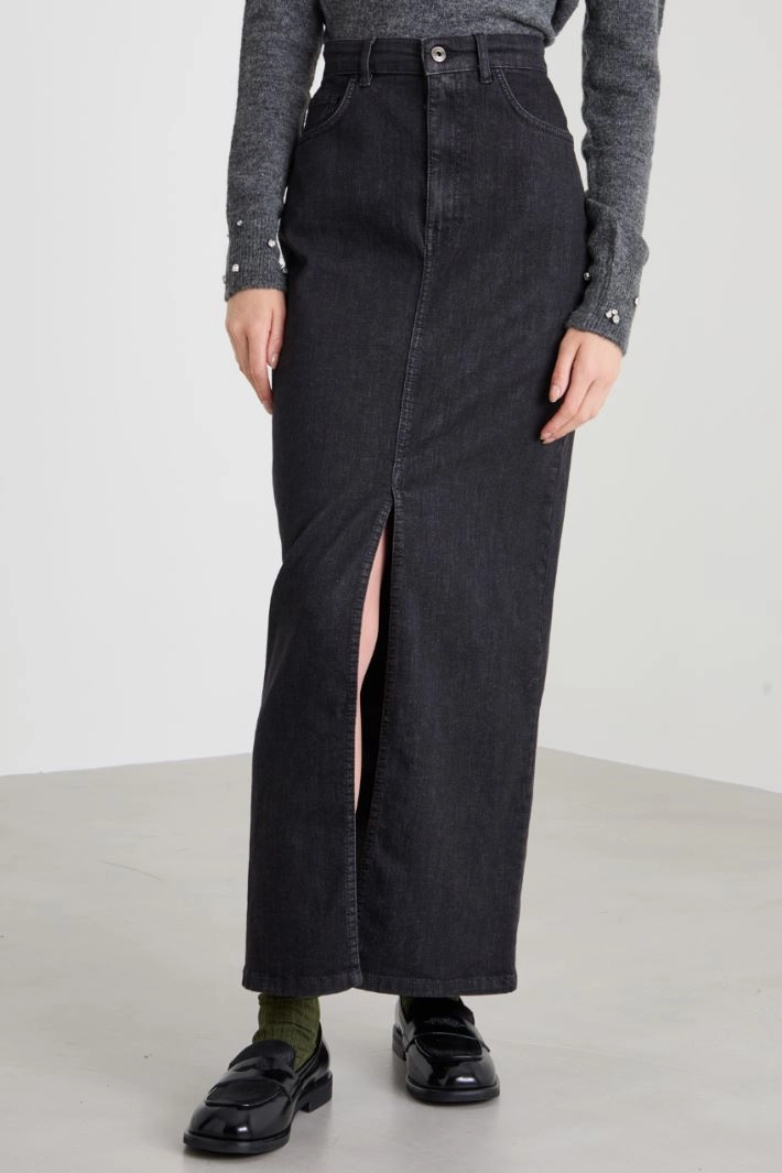 Long straight-fit skirt in stretch cotton denim, with belt loops, five pockets and a slit on the center front. Fastening with a hidden zip and metal button.
