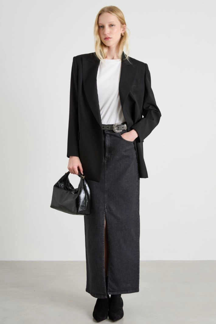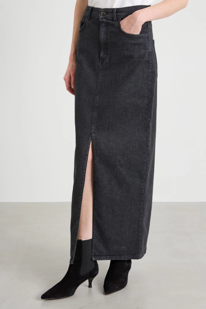 Long straight-fit skirt in stretch cotton denim, with belt loops, five pockets and a slit on the center front. Fastening with a hidden zip and metal button.