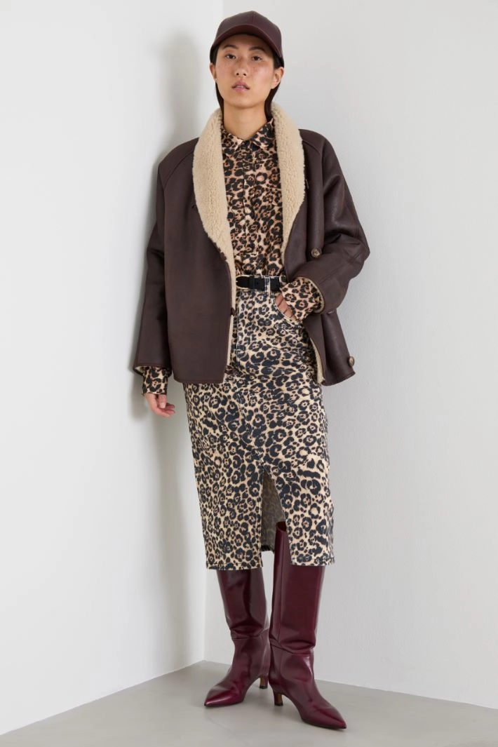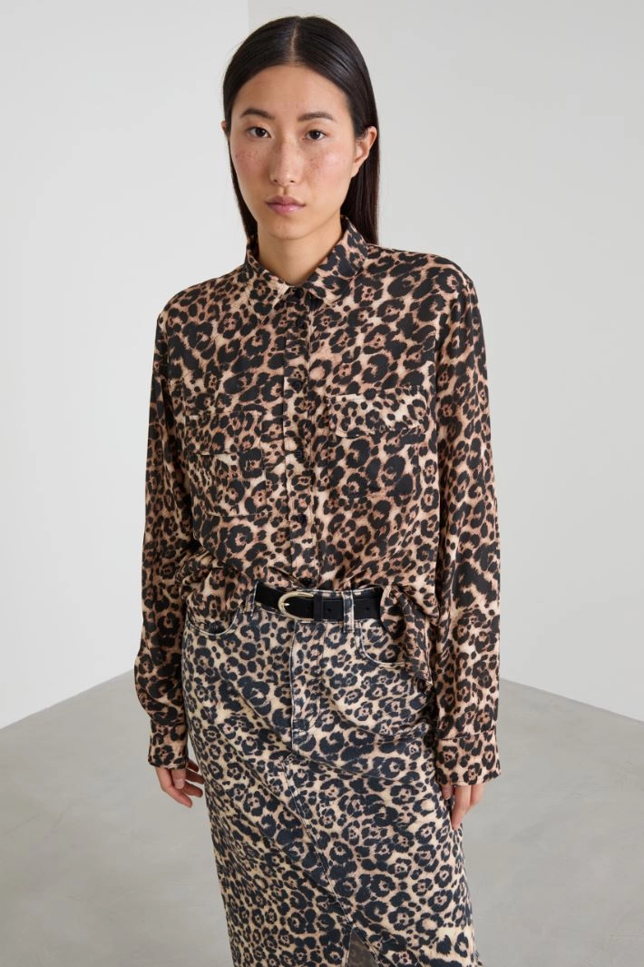 Loose-fitting shirt in flowing pure viscose crepe with an all-over print, featuring a classic collar, long sleeves with cuffs and buttons, and chest pockets with flaps. Yoke cut with a box pleat on the back and visible button fastening.
