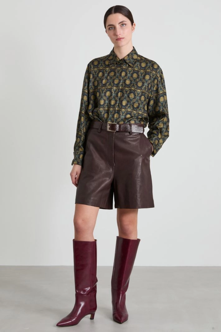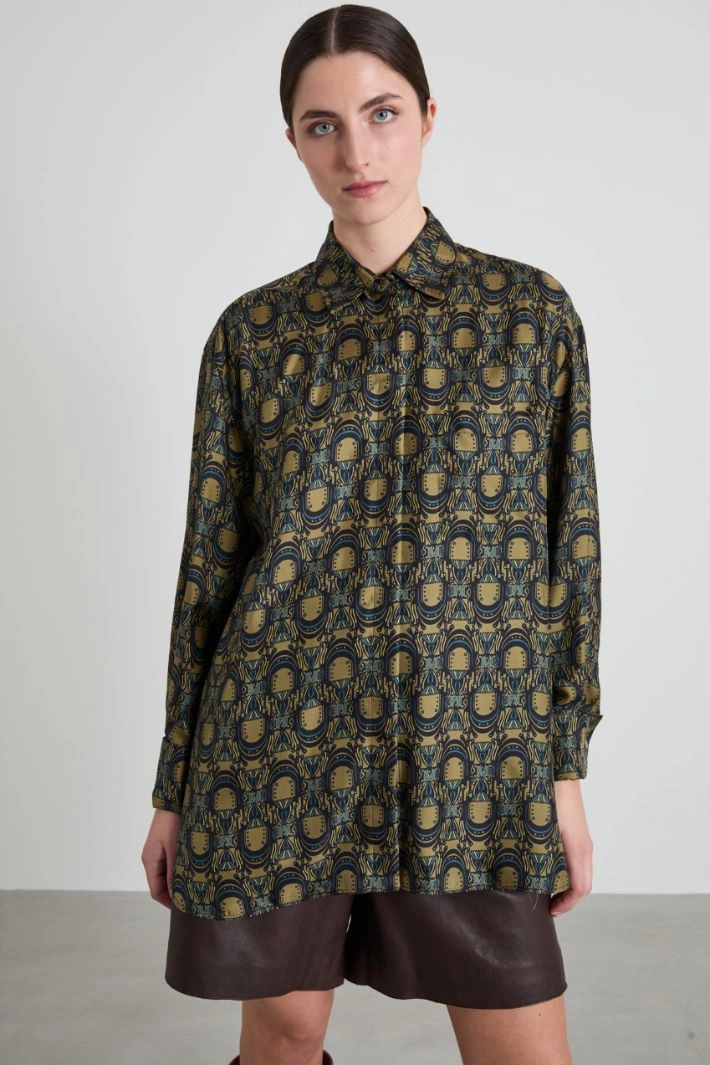 Straight-cut oversized shirt in pure silk twill with an all-over printed motif, classic collar, long sleeves with high cufflinks, patch pocket on the chest and gathered yoke motif on the back. Concealed button fastening. Asymmetrical hem.