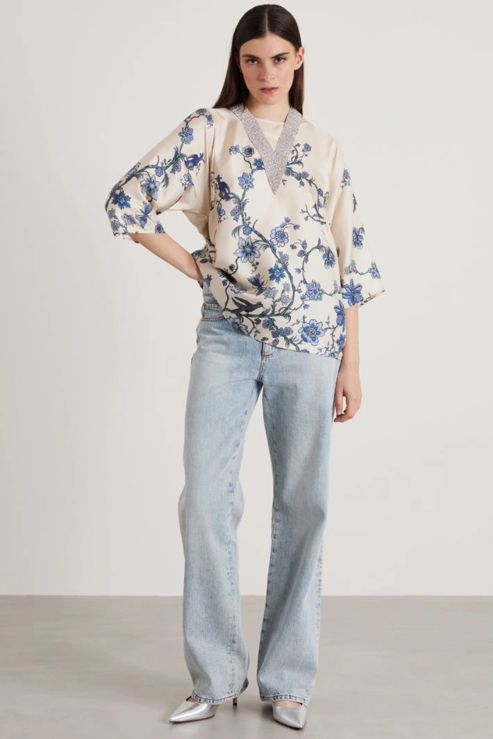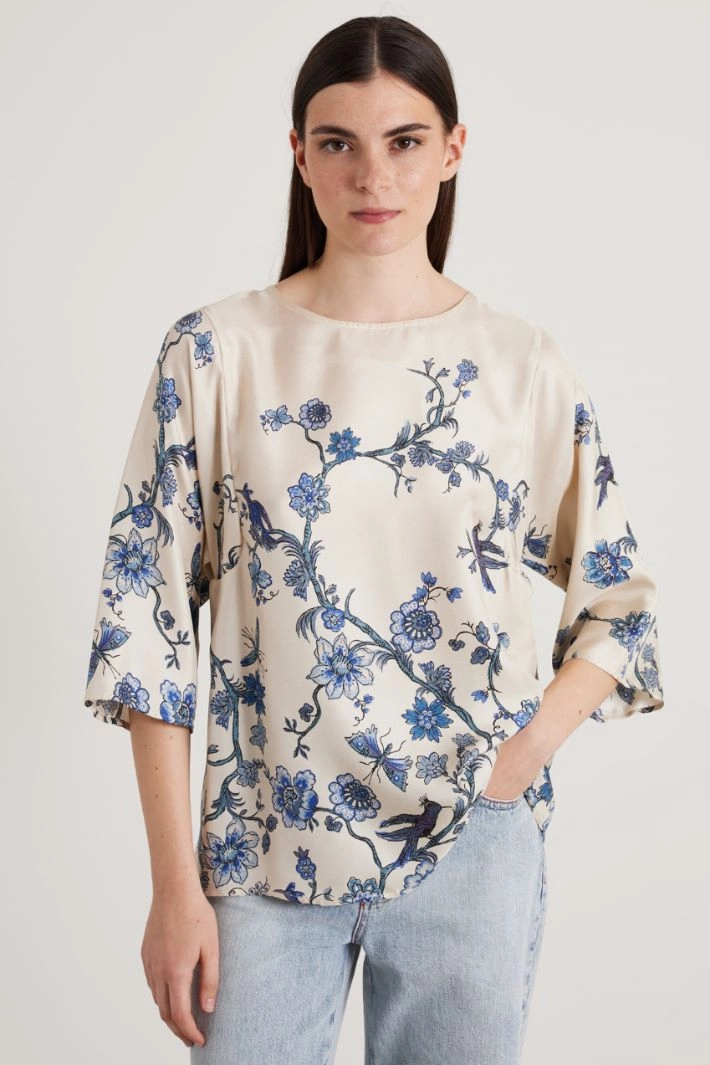 Slightly flared blouse in pure silk twill with all-over print, crew neck, wide three-quarter sleeves and pleat motif on the back. Teardrop fastening with button.