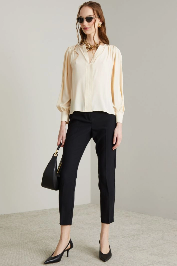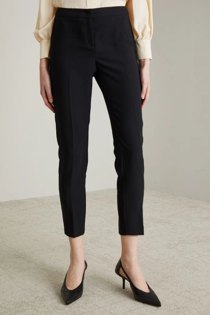 Straight-fit envers satin trousers with waistband and pressed pleat. Zip fastening.