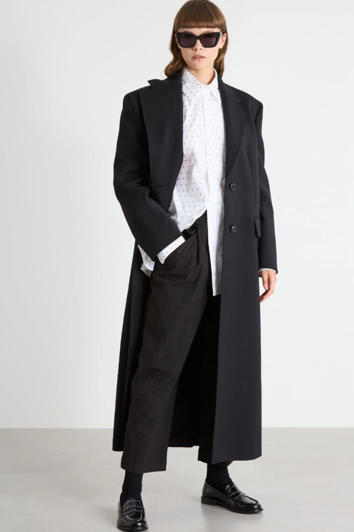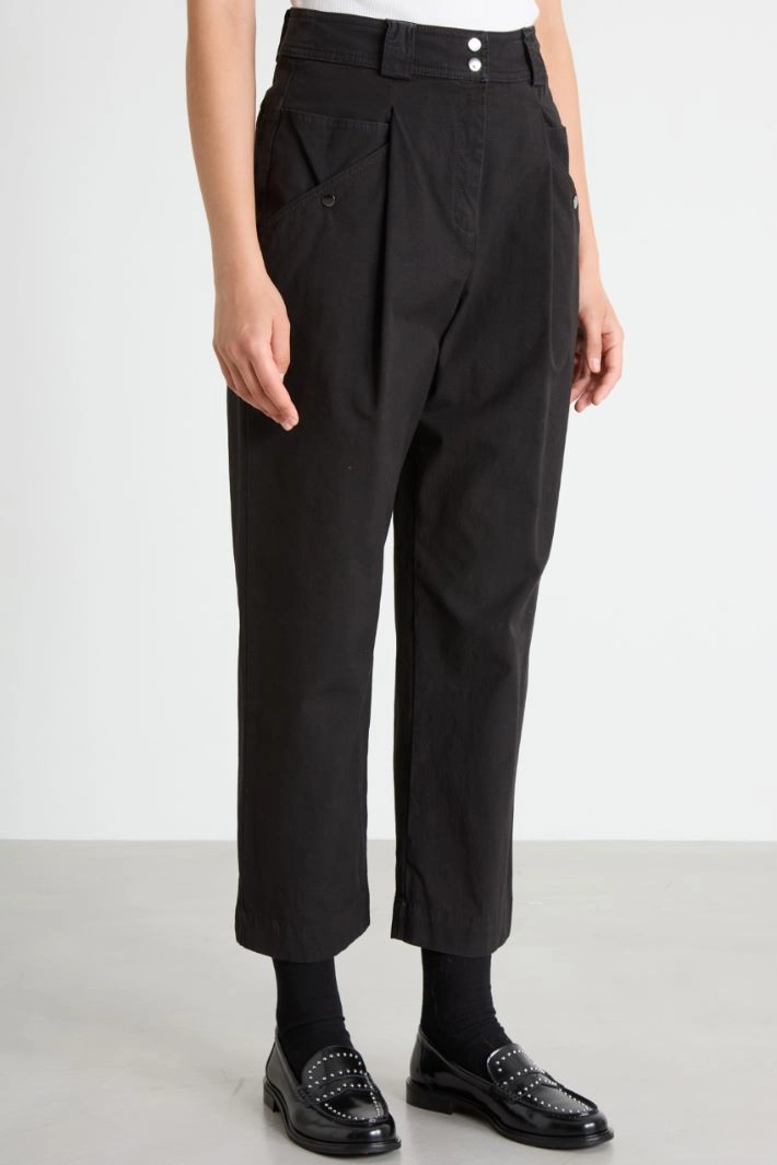Baggy trousers in stretch cotton ripstop, with belt loops, darts at the waist, side French pockets and buttoned pockets on the back, and fastening with a hidden zip and buttons.