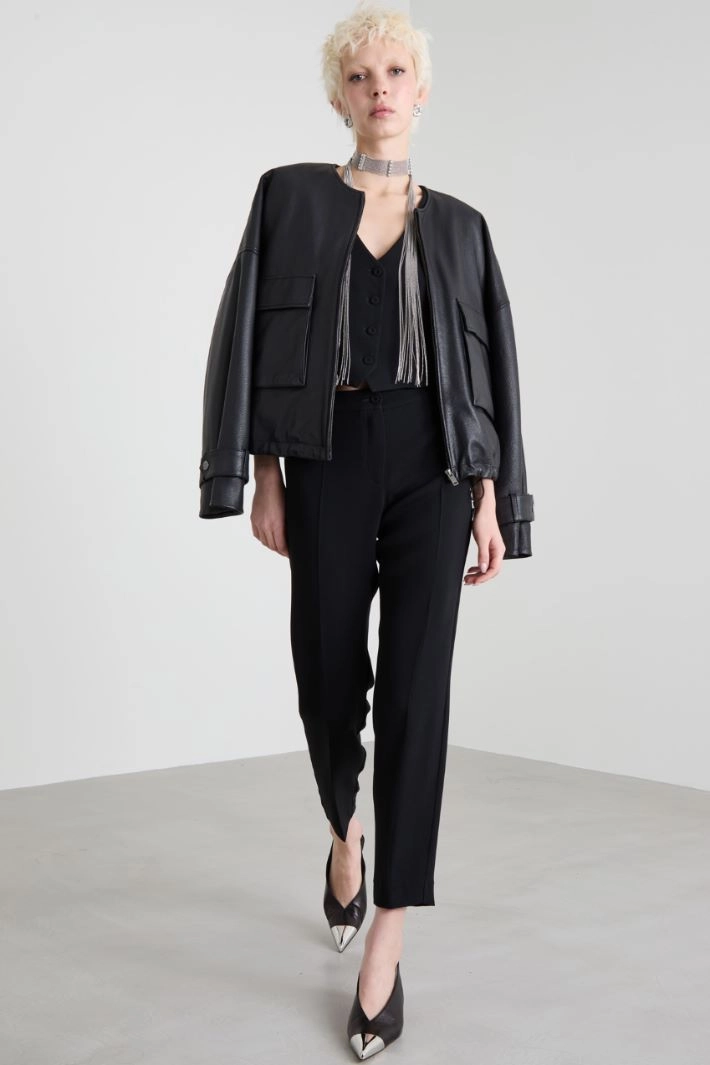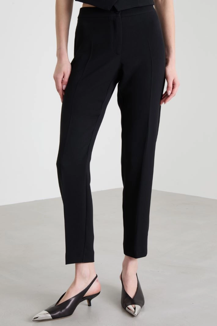 Cigarette trousers in crepe fabric, with pressed crease along the length and fastening with hidden zip and covered button.