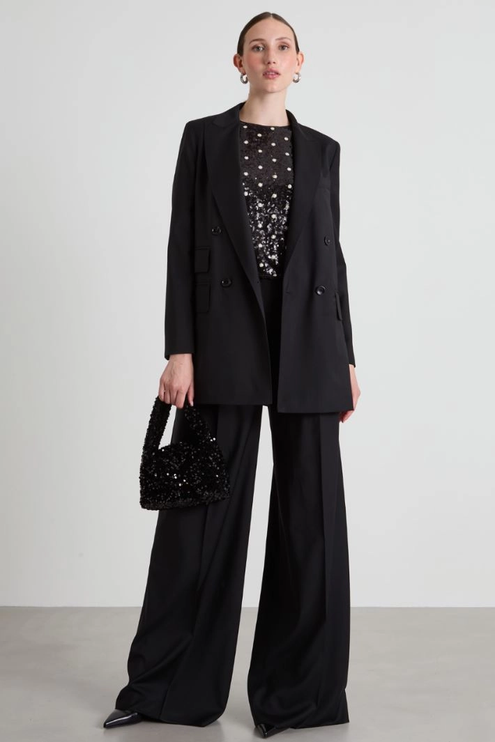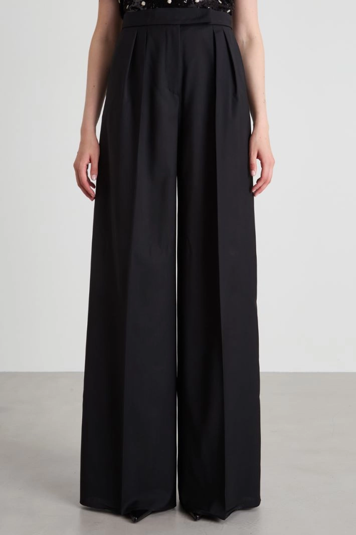 Straight-fit trousers in pure wool canvas, with pleats, French pockets and pressed crease along the length. Hidden fastening with zip, button and hooks.
