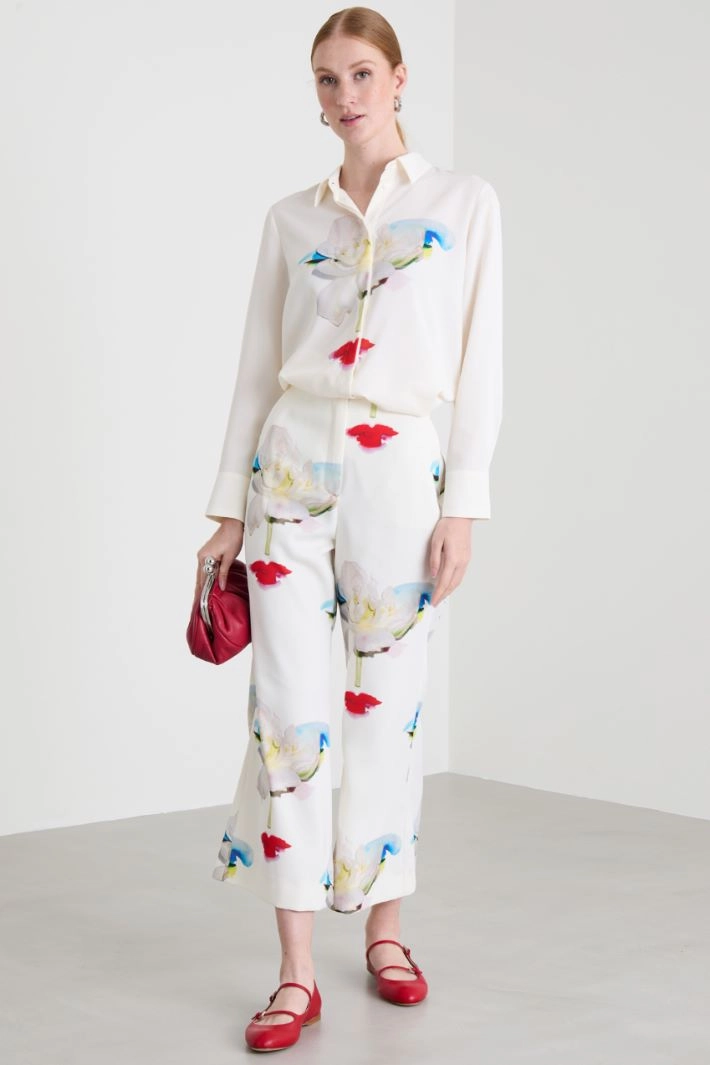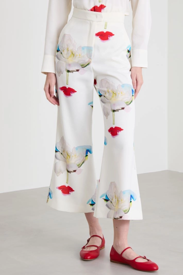 Flare envers satin trousers with a glossy finish printed all over, with side French pockets and welt pockets on the back. Hidden fastening with zip, button and hook.