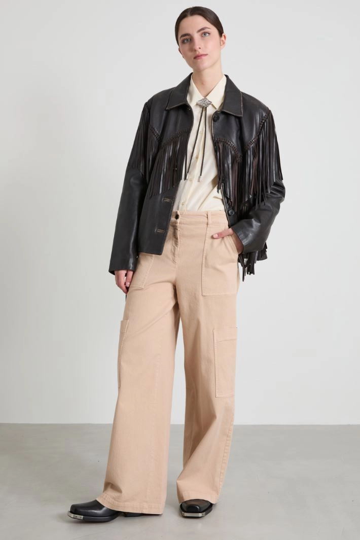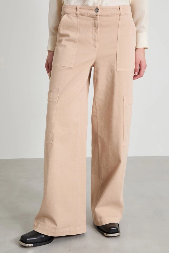 Cargo trousers in stretch cotton bull, with four patch pockets on the front and two on the back, and asymmetric belt loop. Fastening with hidden zip and metal button.