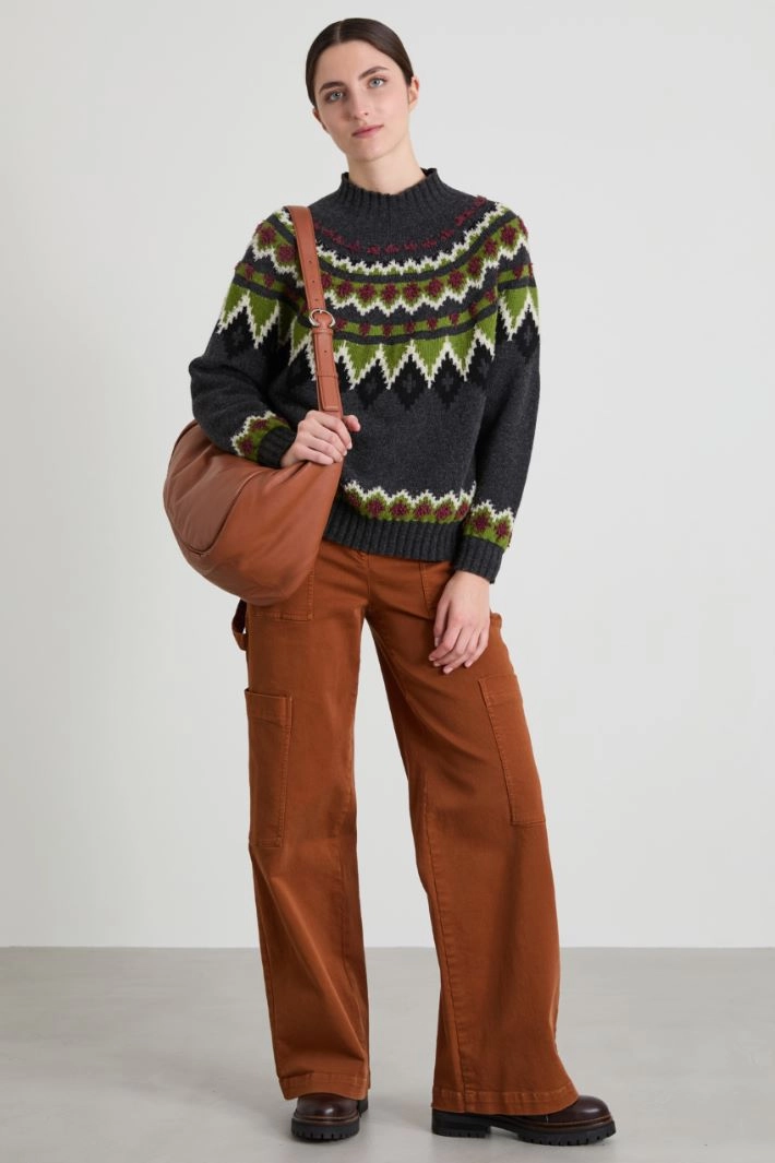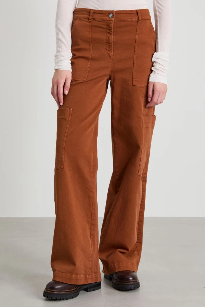 Cargo trousers in stretch cotton bull, with four patch pockets on the front and two on the back, and asymmetric belt loop. Fastening with hidden zip and metal button.