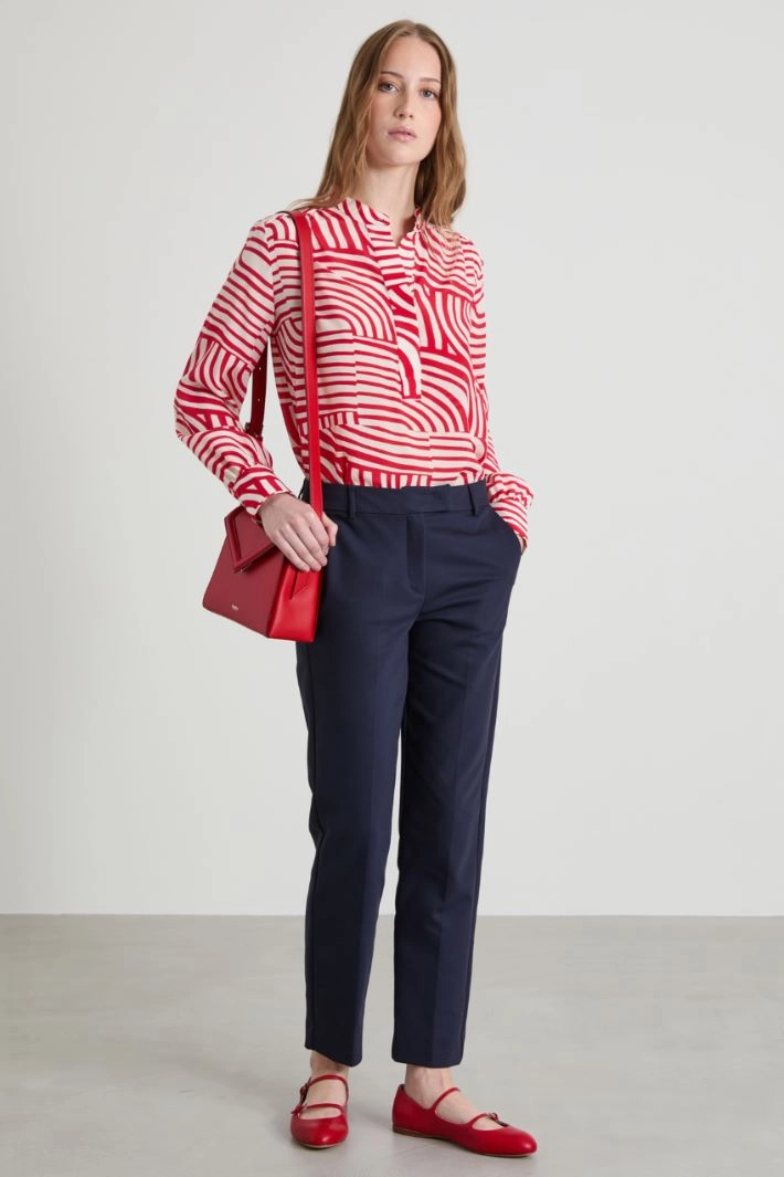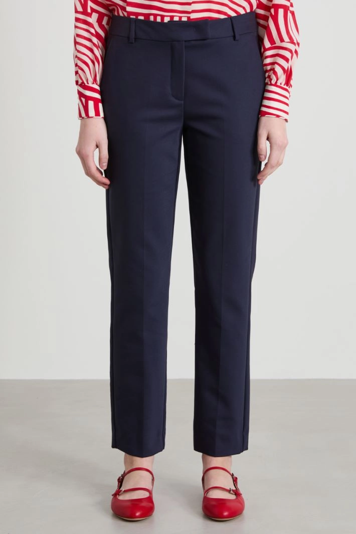 Cigarette trousers in stretch cotton blend canvas, with belt loops at the waist, side French pockets and rear welt pockets, and pressed crease. Fastening with asymmetrical fly with hidden zip, button and hook.