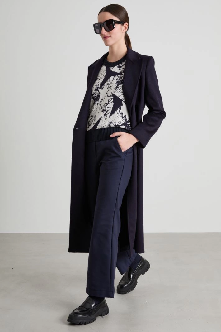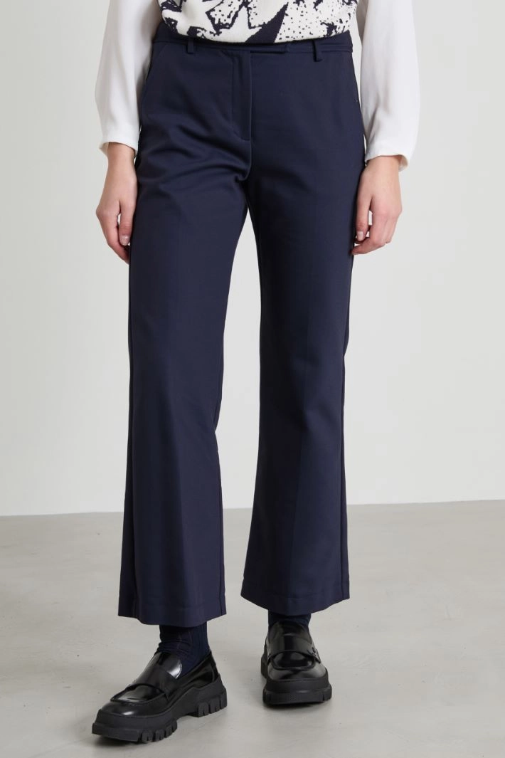 Flared trousers in stretch cotton blend canvas, with belt loops at the waist, French pockets at the front and double welt pockets at the back. Fastening with hidden zip, button and hook.