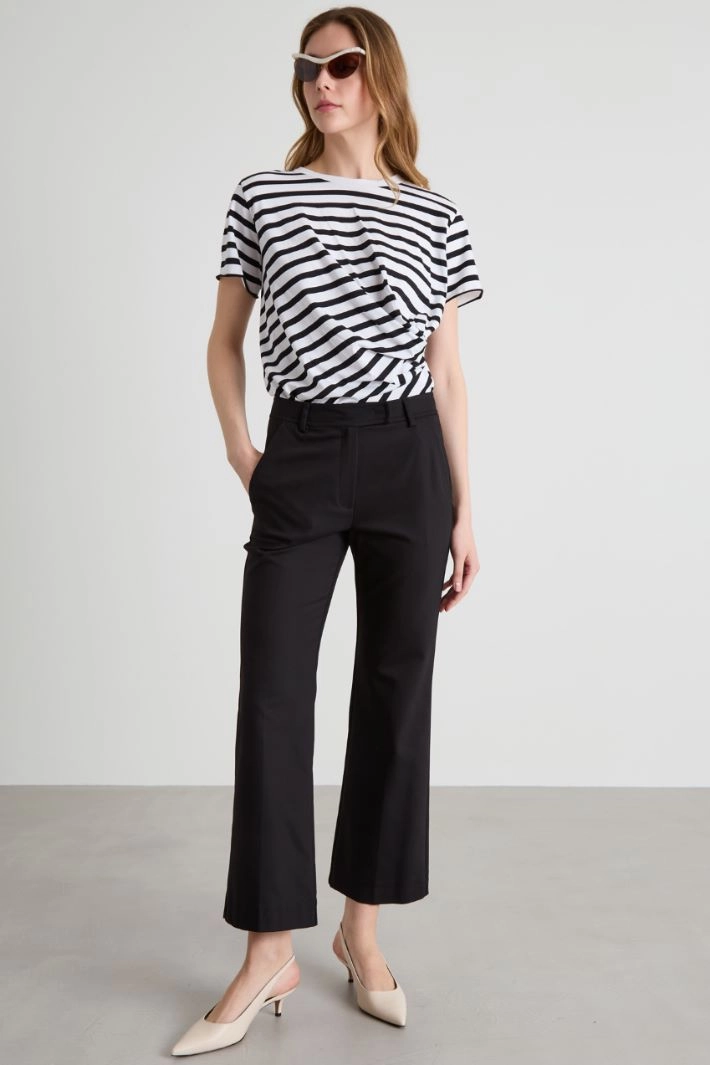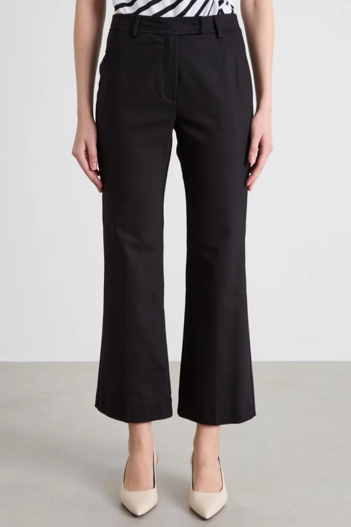 Flared trousers in stretch cotton blend canvas, with belt loops at the waist, French pockets at the front and double welt pockets at the back. Fastening with hidden zip, button and hook.
