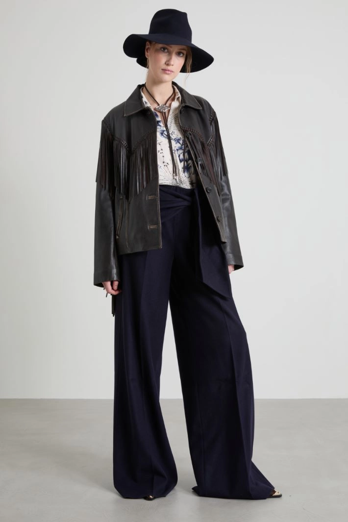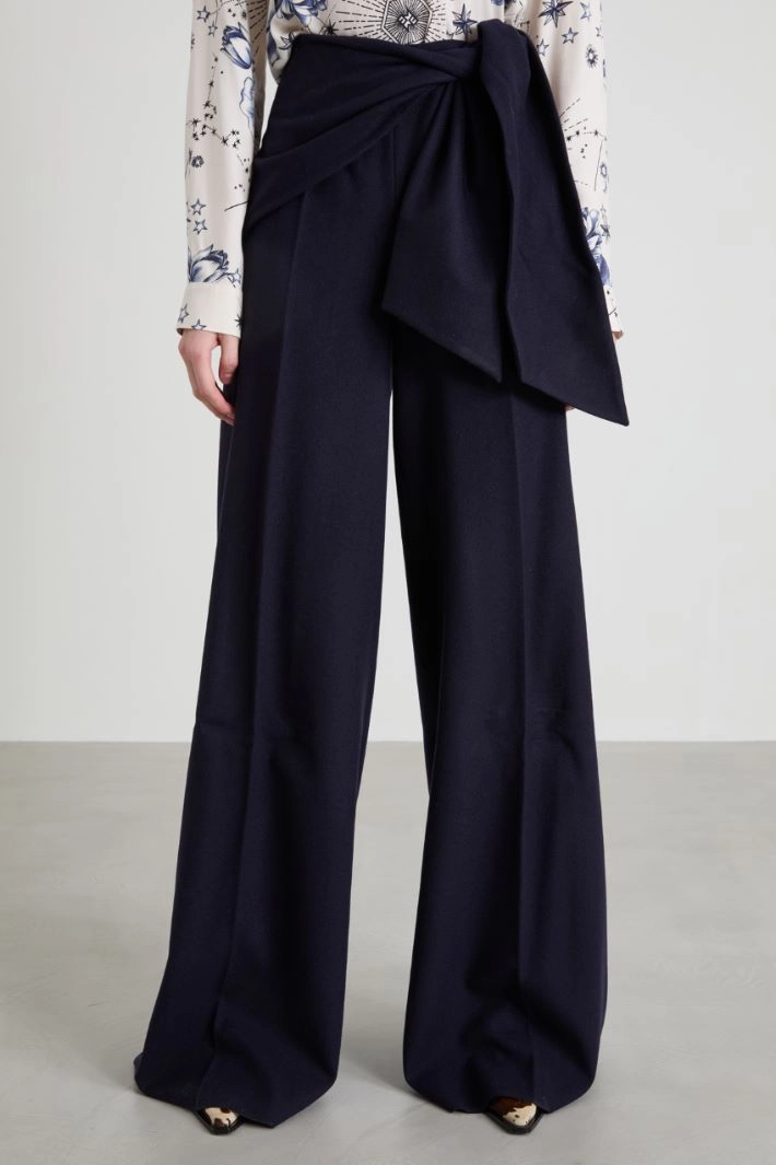 Wide-leg trousers in stretch wool felt, with a sewn and knotted panel on the side, pressed crease lengthwise and fastening with invisible zip and hook on the side.