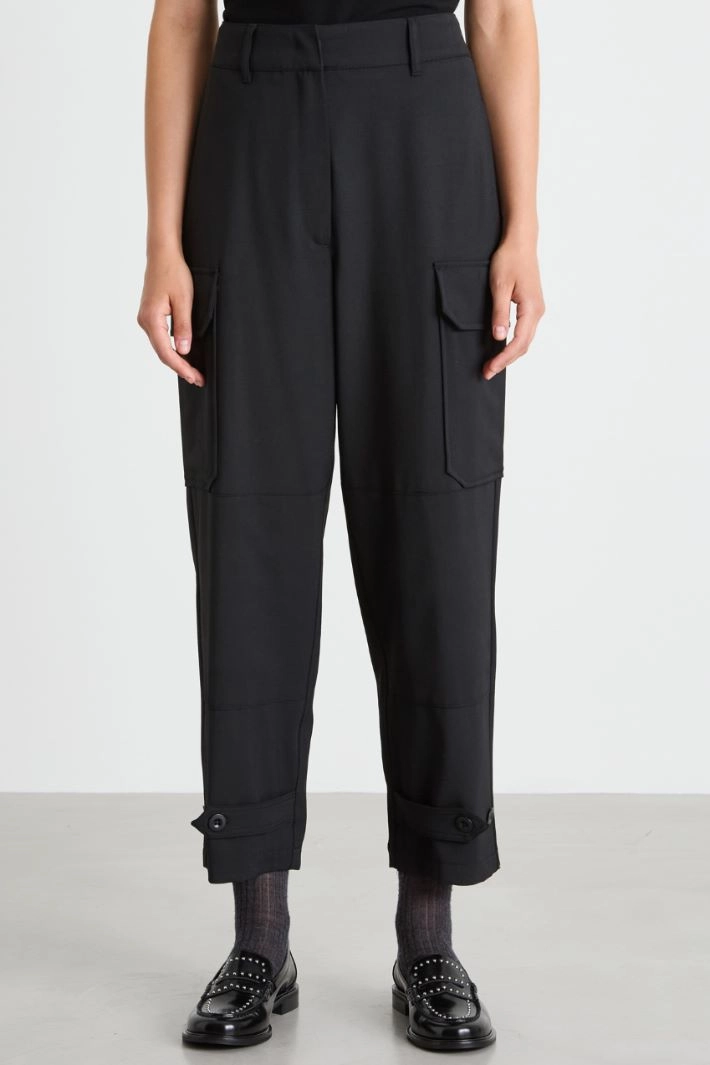 Baggy cargo trousers in stretch wool-blend gabardine, with belt loops, side slant pockets, back welt pockets with flaps, and patch pockets along the leg. Adjustable ankle toggles and a hidden zip, button, and hook fastening.