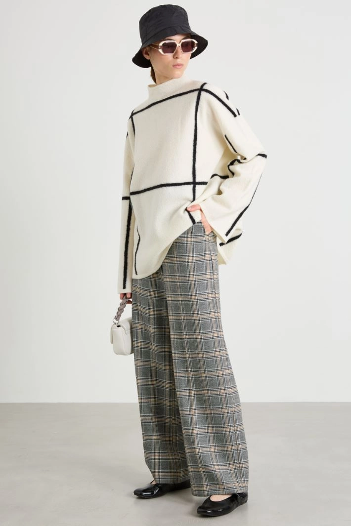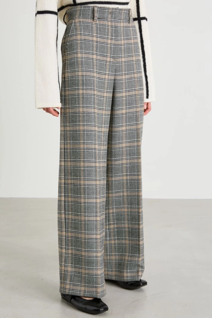Palazzo trousers in pure yarn-dyed wool batavia, with belt loops at the waist, side French pockets and buttoned welt pockets at the back, and crease ironed lengthwise. Hidden fastening with zip, button and hook.
