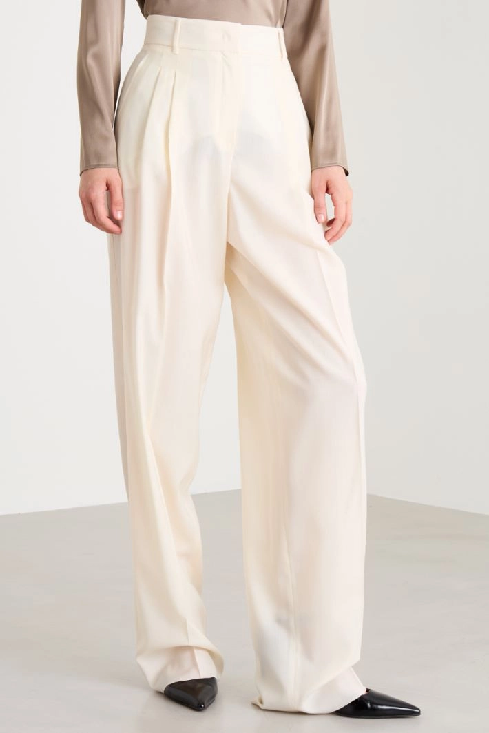 Wide-fit trousers in pure virgin wool gabardine, with belt loops and a double dart at the waist, French pockets, and a pressed pleat along the length. Concealed zip, button, and hook fastening.