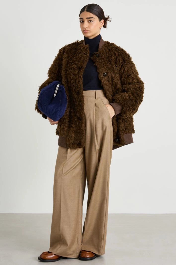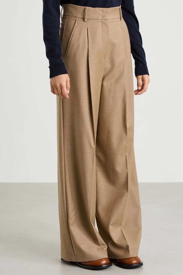 Palazzo trousers in stretch wool flannel, with belt loops, darts at the waist, side French pockets and double welt pockets on the back, pressed crease. Hidden fastening with zip, button and hooks.