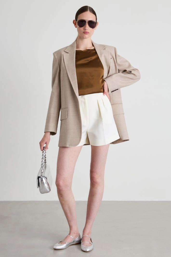 Straight-cut shorts in stretch wool canvas, with topstitching, double pleats at the waist, side French pockets and hidden fastening with zip, button and hooks.
