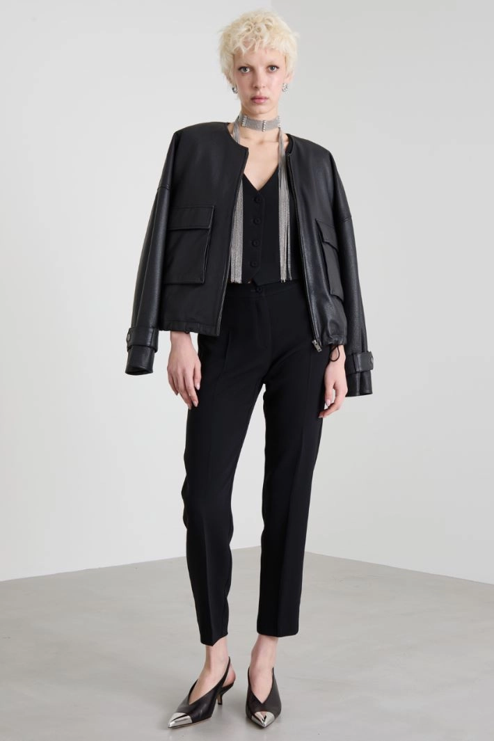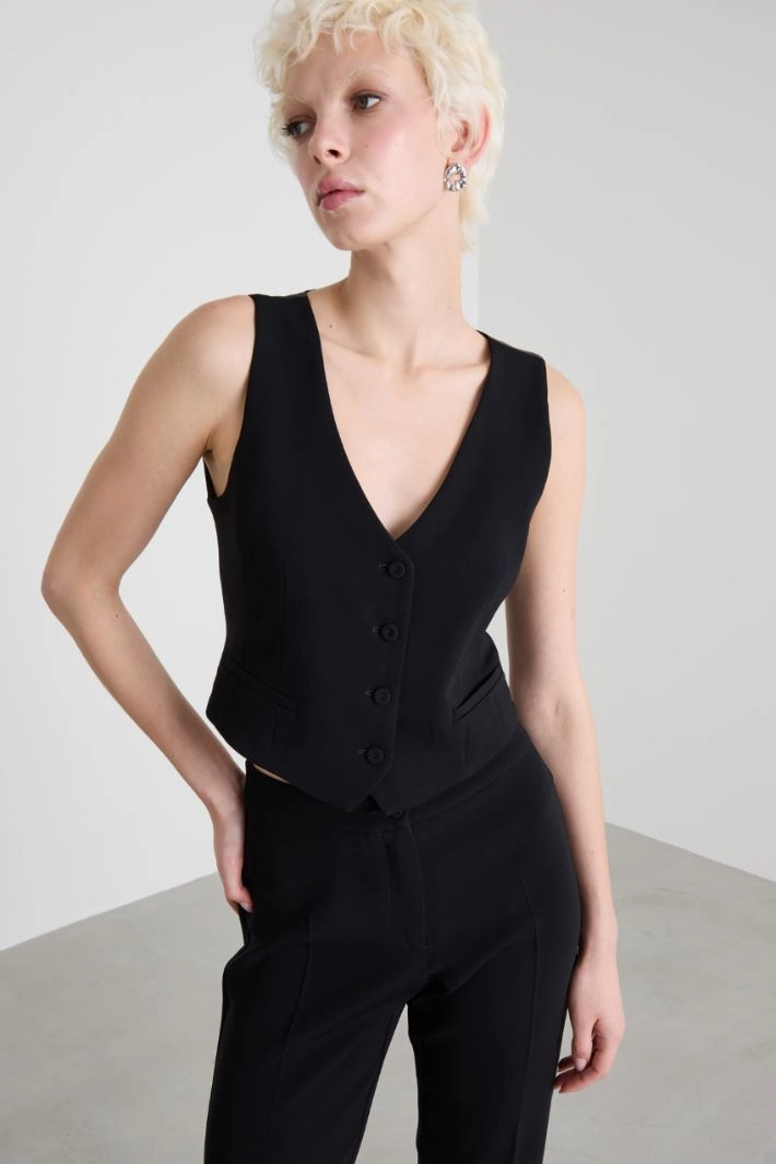 Semi-fitted gilet in flowing fabric and satin on the back, with a V-neck, welt pockets on the front and adjustable ties on the back. Button fastening. Lined.