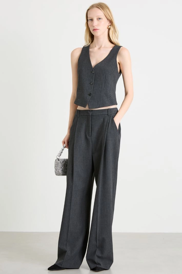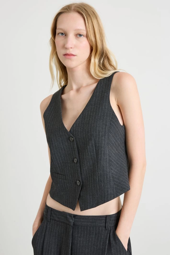 Semi-fitted gilet in a pinstriped viscose blend, with a V-neck and a fake welt pocket. Button fastening.