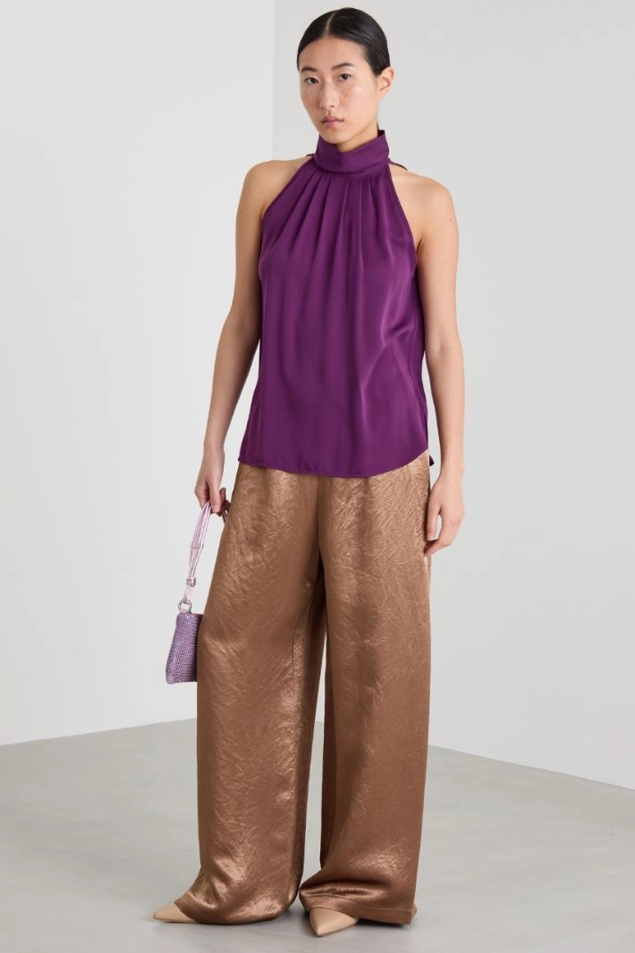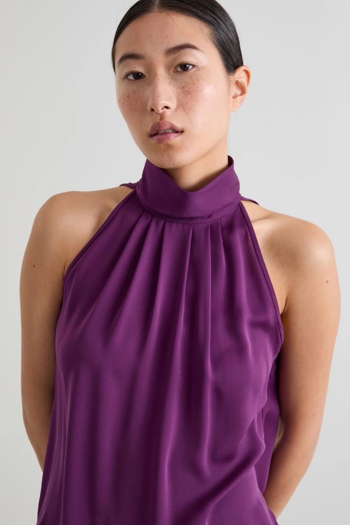Flowing halter top in pure silk fabric, with a high neckline finished with a pleated motif, sleeveless and side slits at the bottom. Teardrop fastening with covered buttons on the back.