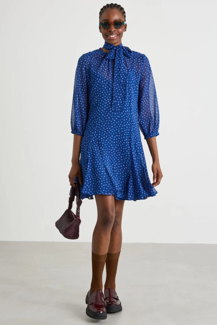 Loose-fitting georgette dress with a round neckline and V-neckline, a removable sash and long sleeves with buttoned cuffs. Matching slip.